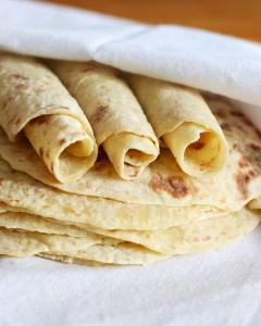 Lefse is a traditional soft Norwegian flatbread. It is made with riced potatoes, can include all purpose (wheat) flour, and includes butter, and milk, cream, or lard. It is cooked on a large, flat griddle.