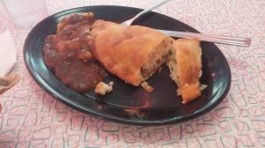 Famous in North Dakota is this food called Fleischkuechle. It is served with mashed potatoes and gravy has beef and sauerkraut in it and some kind of cheese. Its pretty good